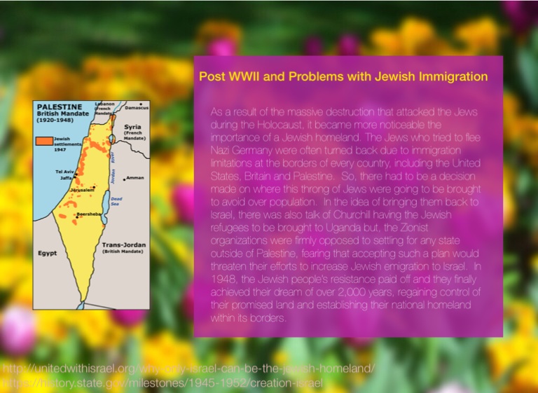 As a result of the massive destruction that attacked the Jews during the Holocaust, it became more noticeable the importance of a Jewish homeland. The Jews who tried to flee Nazi Germany were often turned back due to immigration limitations at the borders of every country, including the United States, Britain and Palestine. So, there had to be a decision made on where this throng of Jews were going to be brought to avoid over population. In the idea of bringing them back to Israel, there was also talk of Churchill having the Jewish refugees to be brought to Uganda but, the Zionist organizations were firmly opposed to settling for any state outside of Palestine, fearing that accepting such a plan would threaten their efforts to increase Jewish emigration to Israel. In 1948, the Jewish people’s resistance paid off and they finally achieved their dream of over 2,000 years, regaining control of their promised land and establishing their national homeland within its borders.