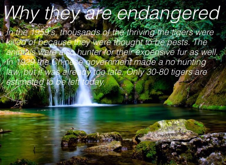 In the 1959's, thousands of the thriving the tigers were killed of because they were thought to be pests. The animals were also hunter for their expensive fur as well. In 1929 the Chinese government made a no hunting law, but it was already too late. Only 30-80 tigers are estimated to be left today.