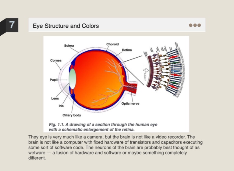 They eye is very much like a camera, but the brain is not like a video recorder. The brain is not like a computer with fixed hardware of transistors and capacitors executing some sort of software code. The neurons of the brain are probably best thought of as wetware — a fusion of hardware and software or maybe something completely different.
