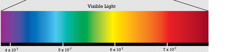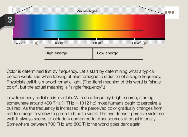 Low frequency radiation is invisible. With an adequately bright source, starting somewhere around 400 THz (1 THz = 1012 Hz) most humans begin to perceive a dull red. As the frequency is increased, the perceived color gradually changes from red to orange to yellow to green to blue to violet. The eye doesn't perceive violet so well. It always seems to look dark compared to other sources at equal intensity. Somewhere between 700 THz and 800 THz the world goes dark again.