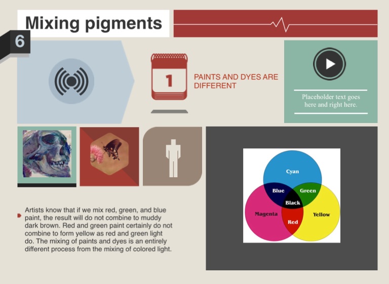 Artists know that if we mix red, green, and blue paint, the result will do not combine to muddy dark brown. Red and green paint certainly do not combine to form yellow as red and green light do. The mixing of paints and dyes is an entirely different process from the mixing of colored light.