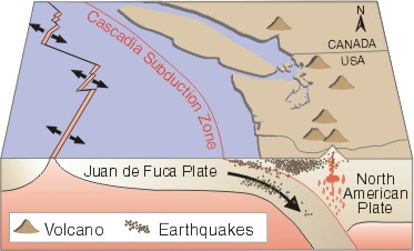 Washington-Oregon coastline - The Juan de Fuca plate is going underneath the North American plate, which is called subduction.