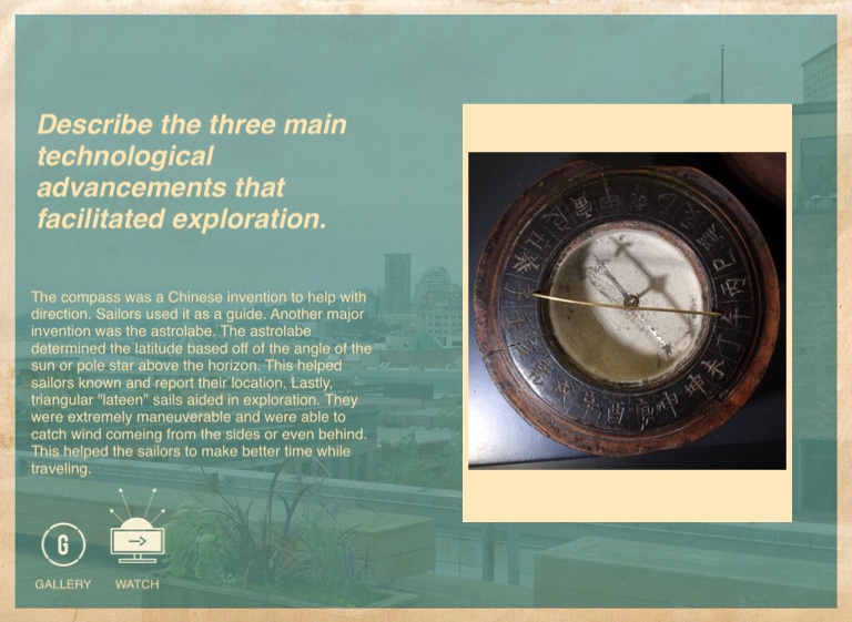 The compass was a Chinese invention to help with direction. Sailors used it as a guide. Another major invention was the astrolabe. The astrolabe determined the latitude based off of the angle of the sun or pole star above the horizon. This helped sailors known and report their location. Lastly, triangular "lateen" sails aided in exploration. They were extremely maneuverable and were able to catch wind comeing from the sides or even behind. This helped the sailors to make better time while traveling.