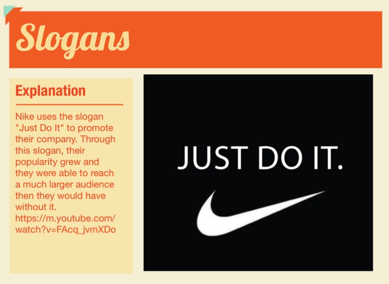Nike uses the slogan "Just Do It" to promote their company. Through this slogan, their popularity grew and they were able to reach a much larger audience then they would have without it.