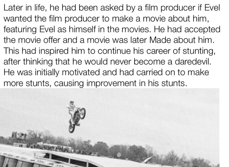 Later in life, he had been asked by a film producer if Evel wanted the film producer to make a movie about him, featuring Evel as himself in the movies. He had accepted the movie offer and a movie was later Made about him. This had inspired him to continue his career of stunting, after thinking that he would never become a daredevil. He was initially motivated and had carried on to make more stunts, causing improvement in his stunts.