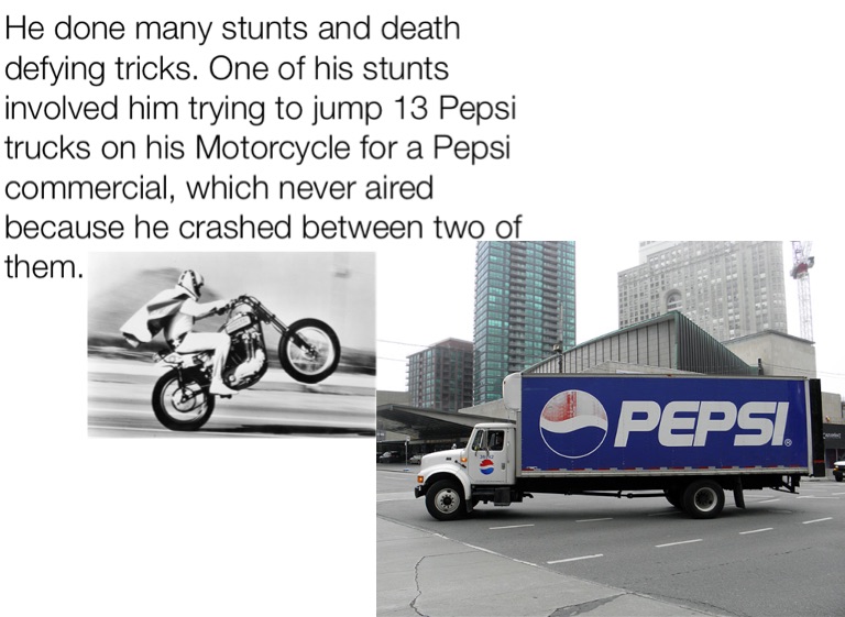 He done many stunts and death defying tricks. One of his stunts involved him trying to jump 13 Pepsi trucks on his Motorcycle for a Pepsi commercial, which never aired because he crashed between two of them.