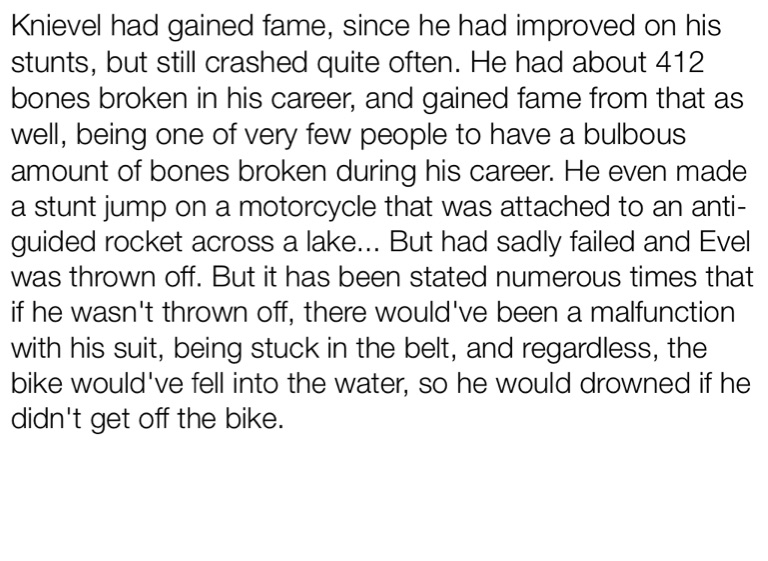 Knievel had gained fame, since he had improved on his stunts, but still crashed quite often. He had about 412 bones broken in his career, and gained fame from that as well, being one of very few people to have a bulbous amount of bones broken during his career. He even made a stunt jump on a motorcycle that was attached to an anti-guided rocket across a lake... But had sadly failed and Evel was thrown off. But it has been stated numerous times that if he wasn't thrown off, there would've been a malfunction with his suit, being stuck in the belt, and regardless, the bike would've fell into the water, so he would drowned if he didn't get off the bike.