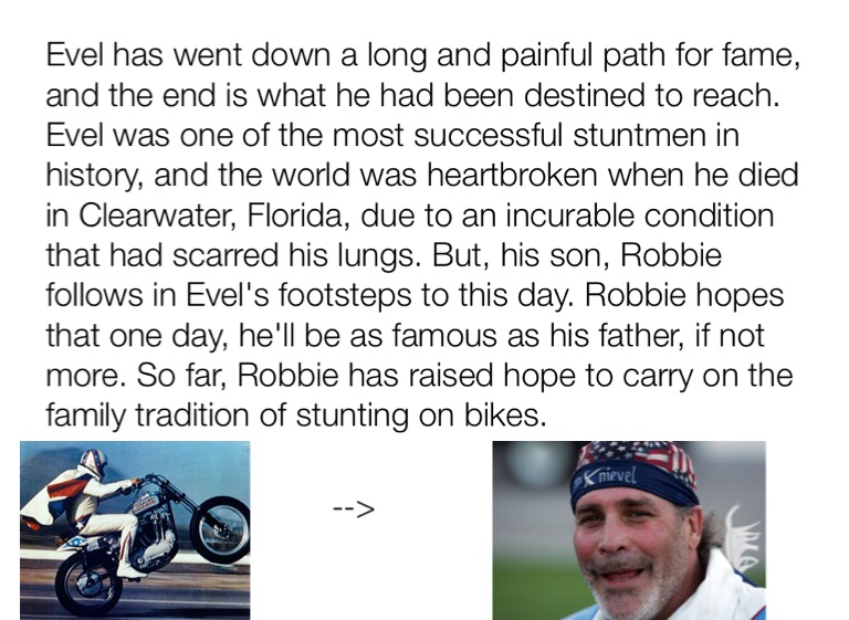 Evel has went down a long and painful path for fame, and the end is what he had been destined to reach. Evel was one of the most successful stuntmen in history, and the world was heartbroken when he died in Clearwater, Florida, due to an incurable condition that had scarred his lungs. But, his son, Robbie follows in Evel's footsteps to this day. Robbie hopes that one day, he'll be as famous as his father, if not more. So far, Robbie has raised hope to carry on the family tradition of stunting on bikes.
