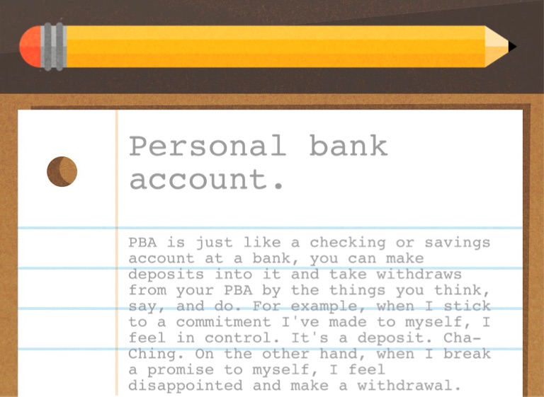PBA is just like a checking or savings account at a bank, you can make deposits into it and take withdraws from your PBA by the things you think, say, and do. For example, when I stick to a commitment I've made to myself, I feel in control. It's a deposit. Cha-Ching. On the other hand, when I break a promise to myself, I feel disappointed and make a withdrawal.