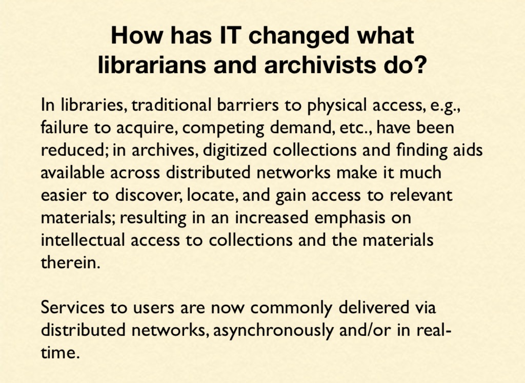 In libraries, traditional barriers to physical access, e.g., failure to acquire, competing demand, etc., have been reduced; in archives, digitized collections and finding aids available across distributed networks make it much easier to discover, locate, and gain access to relevant materials; resulting in an increased emphasis on intellectual access to collections and the materials therein.