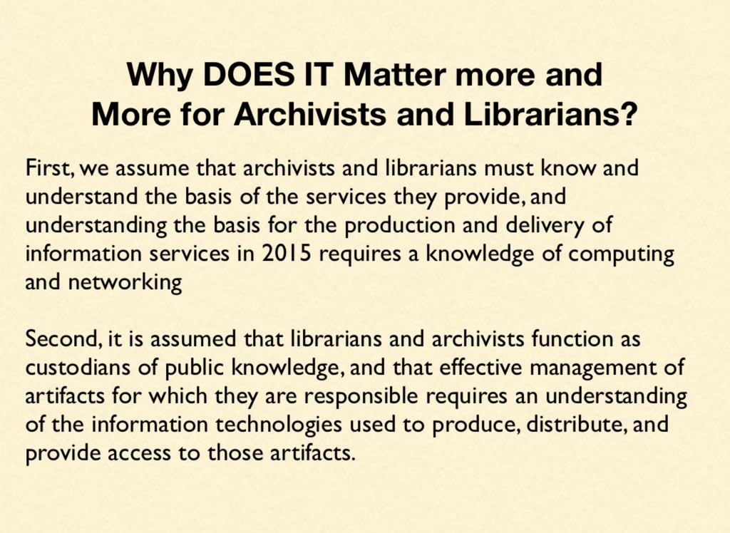 First, we assume that archivists and librarians must know and understand the basis of the services they provide, and understanding the basis for the production and delivery of information services in 2015 requires a knowledge of computing and networking