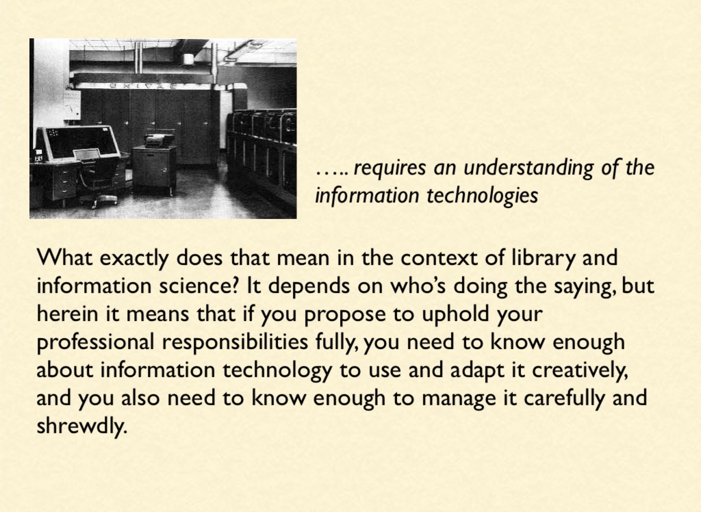 What exactly does that mean in the context of library and information science? It depends on who’s doing the saying, but herein it means that if you propose to uphold your professional responsibilities fully, you need to know enough about information technology to use and adapt it creatively, and you also need to know enough to manage it carefully and shrewdly.