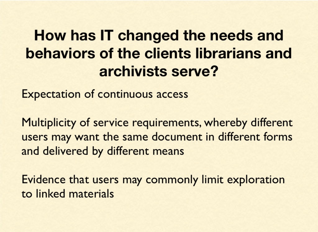 How has IT changed the needs and behaviors of the clients librarians and archivists serve?