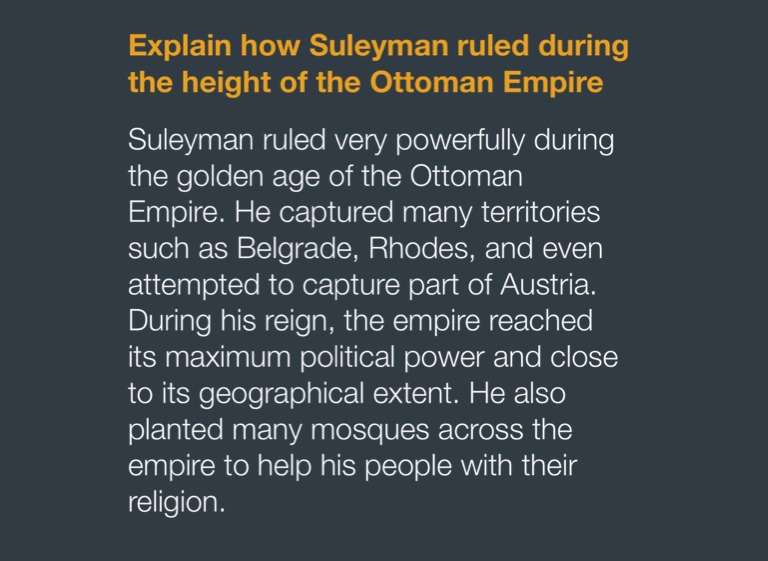 Suleyman ruled very powerfully during the golden age of the Ottoman Empire. He captured many territories such as Belgrade, Rhodes, and even attempted to capture part of Austria. During his reign, the empire reached its maximum political power and close to its geographical extent. He also planted many mosques across the empire to help his people with their religion.