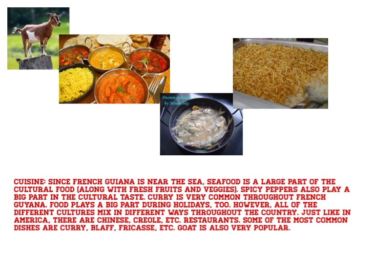 Cuisine: Since French Guiana is near the sea, seafood is a large part of the cultural food (Along with fresh fruits and veggies). Spicy peppers also play a big part in the cultural taste. Curry is very common throughout French Guyana. Food plays a big part during holidays, too. However, all of the different cultures mix in different ways throughout the country. Just like in America, there are Chinese, creole, etc. restaurants. Some of the most common dishes are curry, blaff, fricasse, etc. Goat is also very popular.