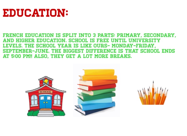 French education is split into 3 parts: primary, secondary, and higher education. School is free until university levels. The school year is like ours- Monday-Friday, September-June. The biggest difference is that school ends at 5:00 Pm!! Also, they get a lot more breaks.