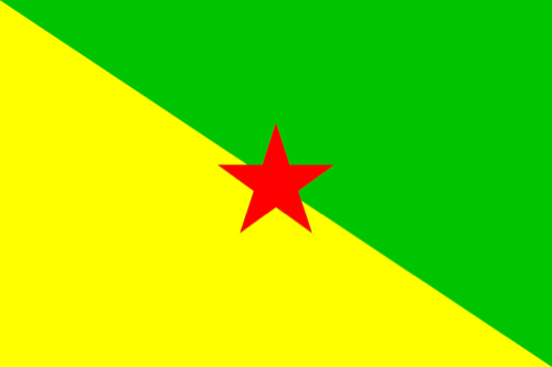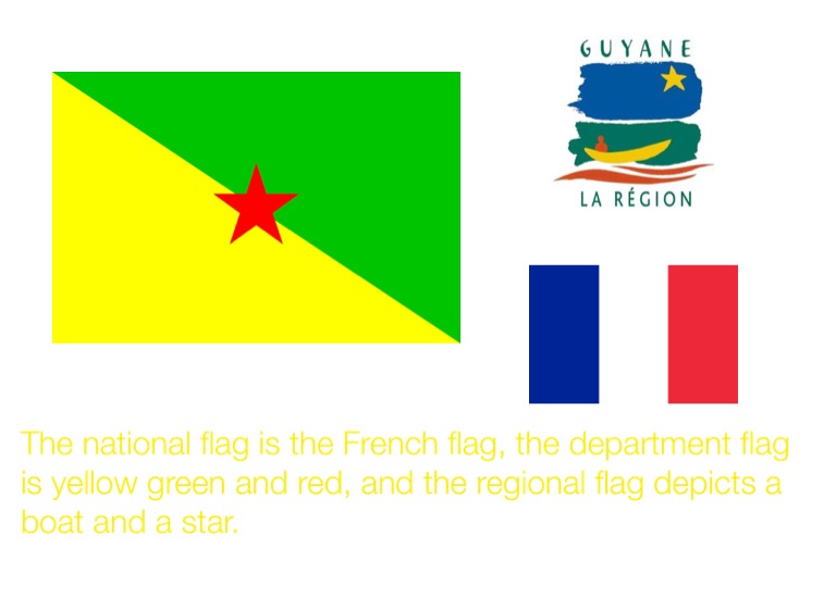 The national flag is the French flag, the department flag is yellow green and red, and the regional flag depicts a boat and a star.