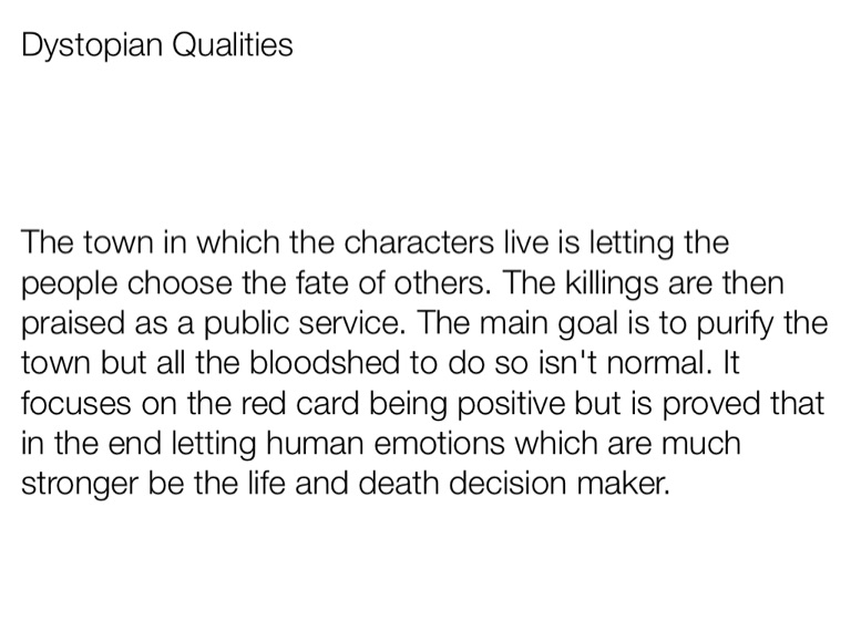 The town in which the characters live is letting the people choose the fate of others. The killings are then praised as a public service. The main goal is to purify the town but all the bloodshed to do so isn't normal. It focuses on the red card being positive but is proved that in the end letting human emotions which are much stronger be the life and death decision maker.