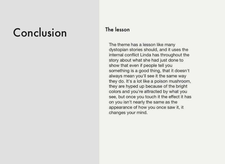 The theme has a lesson like many dystopian stories should, and it uses the internal conflict Linda has throughout the story about what she had just done to show that even if people tell you something is a good thing, that it doesn't always mean you'll see it the same way they do. It's a lot like a poison mushroom, they are hyped up because of the bright colors and you're attracted by what you see, but once you touch it the effect it has on you isn't nearly the same as the appearance of how you once saw it, it changes your mind.