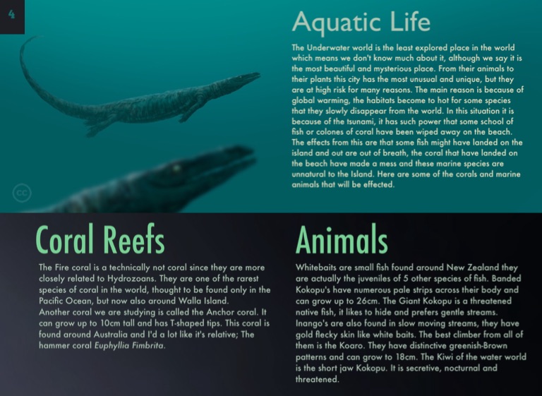 The Underwater world is the least explored place in the world which means we don't know much about it, although we say it is the most beautiful and mysterious place. From their animals to their plants this city has the most unusual and unique, but they are at high risk for many reasons. The main reason is because of global warming, the habitats become to hot for some species that they slowly disappear from the world. In this situation it is because of the tsunami, it has such power that some school of fish or colones of coral have been wiped away on the beach. The effects from this are that some fish might have landed on the island and out are out of breath, the coral that have landed on the beach have made a mess and these marine species are unnatural to the Island. Here are some of the corals and marine animals that will be effected.