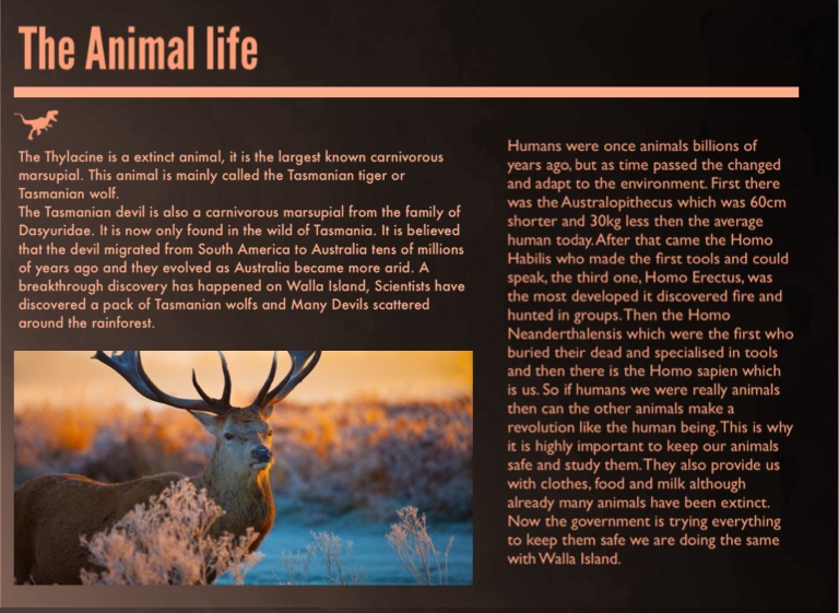 Humans were once animals billions of years ago, but as time passed the changed and adapt to the environment. First there was the Australopithecus which was 60cm shorter and 30kg less then the average human today. After that came the Homo Habilis who made the first tools and could speak, the third one, Homo Erectus, was the most developed it discovered fire and hunted in groups. Then the Homo Neanderthalensis which were the first who buried their dead and specialised in tools and then there is the Homo sapien which is us. So if humans we were really animals then can the other animals make a revolution like the human being. This is why it is highly important to keep our animals safe and study them. They also provide us with clothes, food and milk although already many animals have been extinct. Now the government is trying everything to keep them safe we are doing the same with Walla Island.