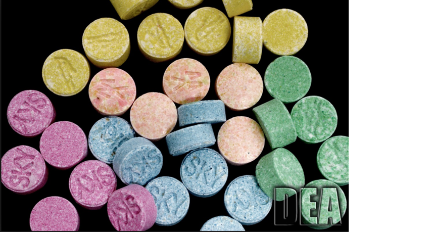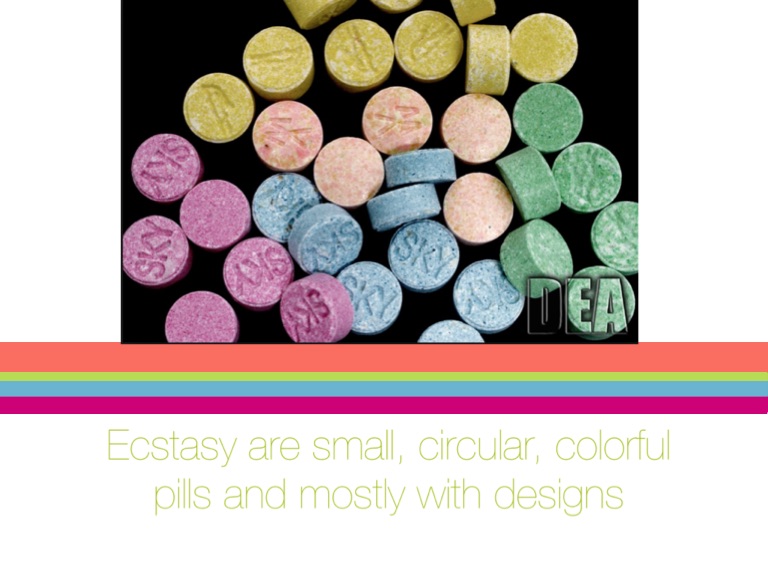 Ecstasy are small, circular, colorful pills and mostly with designs