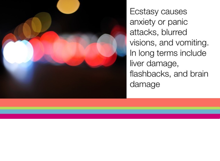 Ecstasy causes anxiety or panic attacks, blurred visions, and vomiting. In long terms include liver damage, flashbacks, and brain damage