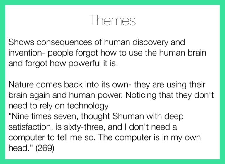 Shows consequences of human discovery and invention- people forgot how to use the human brain and forgot how powerful it is.