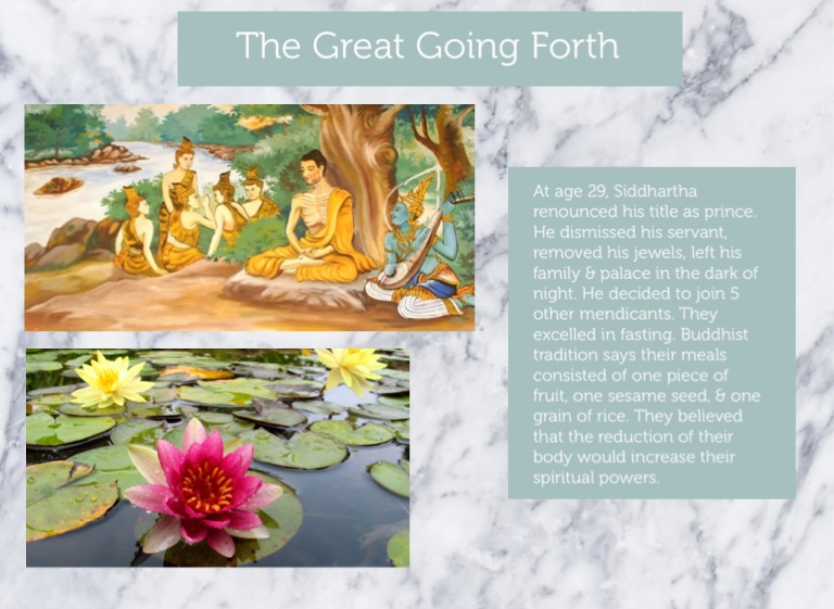 At age 29, Siddhartha renounced his title as prince. He dismissed his servant, removed his jewels, left his family & palace in the dark of night. He decided to join 5 other mendicants. They excelled in fasting. Buddhist tradition says their meals consisted of one piece of fruit, one sesame seed, & one grain of rice. They believed that the reduction of their body would increase their spiritual powers.