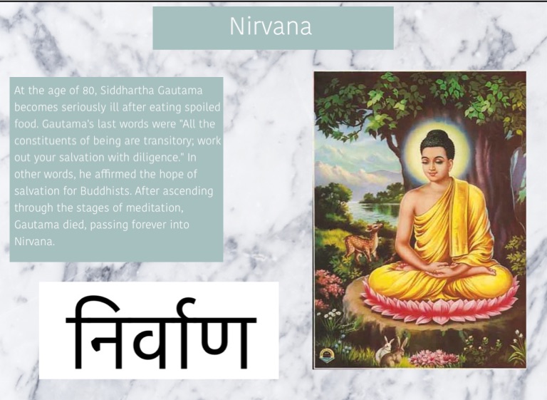 At the age of 80, Siddhartha Gautama becomes seriously ill after eating spoiled food. Gautama's last words were "All the constituents of being are transitory; work out your salvation with diligence." In other words, he affirmed the hope of salvation for Buddhists. After ascending through the stages of meditation, Gautama died, passing forever into Nirvana.