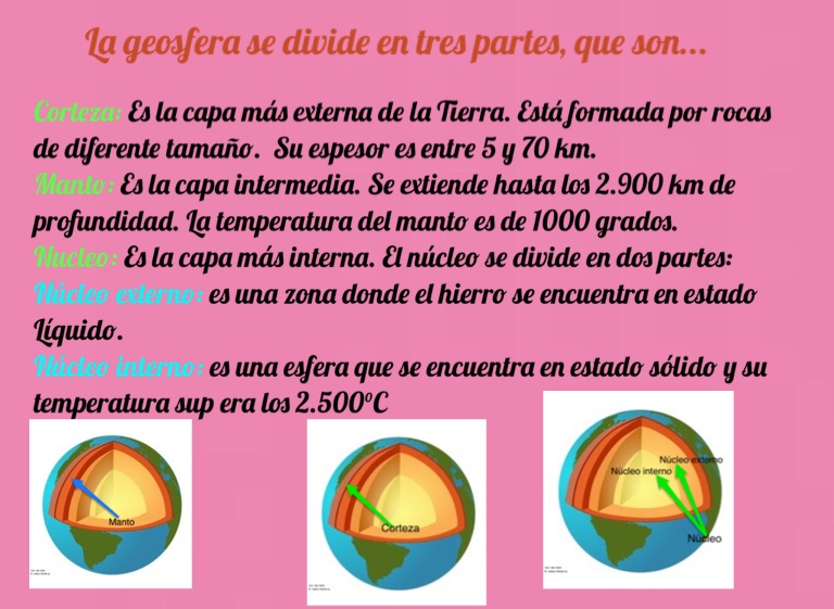 La geosfera se divide en tres partes, que son...