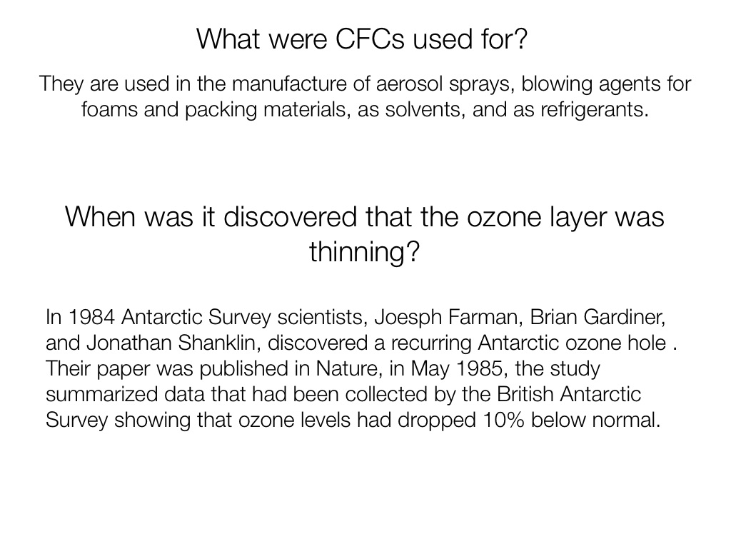 In 1984 Antarctic Survey scientists, Joesph Farman, Brian Gardiner, and Jonathan Shanklin, discovered a recurring Antarctic ozone hole . Their paper was published in Nature, in May 1985, the study summarized data that had been collected by the British Antarctic Survey showing that ozone levels had dropped 10% below normal.
