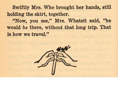 Then Mrs. Whatsit explains that they are going to a foggy planet to see a medium. When they arrive Mrs. Whatsit, Mrs. Who and Mrs. Which intoduce the kids to the happy medium. After that the happy medium show the kids their home planet. The medium was so reluctant to show them something, but the kids get a vision of the dark thing surrounding the earth. Next Mrs. Whatsit explains that almost all the famous people in the world have been fighting the dark thing. Impatient, Meg asks about her father, Mrs. Which informs her that he is held captive on a planet the dark thing has taken over.