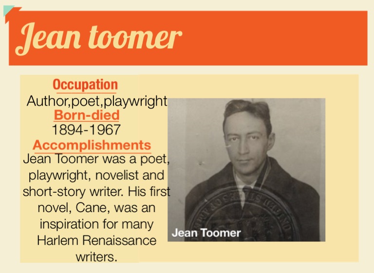 Jean Toomer was a poet, playwright, novelist and short-story writer. His first novel, Cane, was an inspiration for many Harlem Renaissance writers.