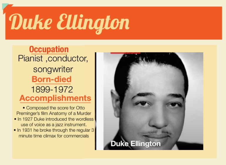 • In 1927 Duke introduced the wordless use of voice as a jazz instrument.