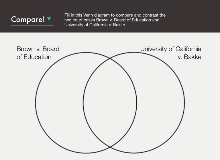 Fill in this Venn diagram to compare and contrast the two court cases Brown v. Board of Education and University of California v. Bakke.