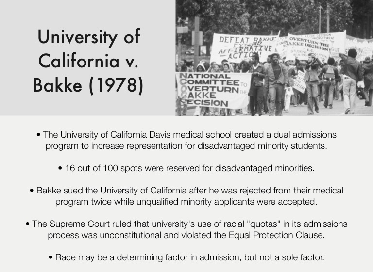 • Bakke sued the University of California after he was rejected from their medical program twice while unqualified minority applicants were accepted.