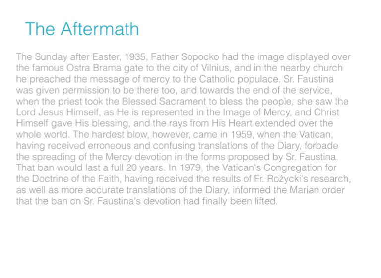 The Sunday after Easter, 1935, Father Sopocko had the image displayed over the famous Ostra Brama gate to the city of Vilnius, and in the nearby church he preached the message of mercy to the Catholic populace. Sr. Faustina was given permission to be there too, and towards the end of the service, when the priest took the Blessed Sacrament to bless the people, she saw the Lord Jesus Himself, as He is represented in the Image of Mercy, and Christ Himself gave His blessing, and the rays from His Heart extended over the whole world. The hardest blow, however, came in 1959, when the Vatican, having received erroneous and confusing translations of the Diary, forbade the spreading of the Mercy devotion in the forms proposed by Sr. Faustina. That ban would last a full 20 years. In 1979, the Vatican's Congregation for the Doctrine of the Faith, having received the results of Fr. Rożycki's research, as well as more accurate translations of the Diary, informed the Marian order that the ban on Sr. Faustina's devotion had finally been lifted.