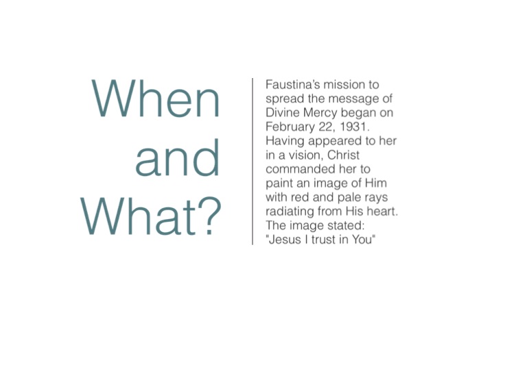 Faustina’s mission to spread the message of Divine Mercy began on February 22, 1931. Having appeared to her in a vision, Christ commanded her to paint an image of Him with red and pale rays radiating from His heart. The image stated: "Jesus I trust in You"