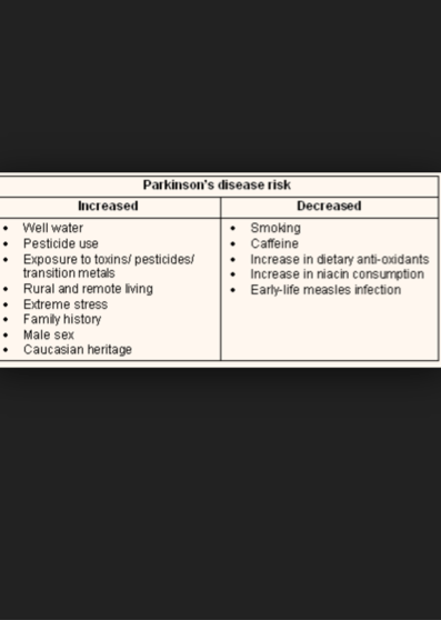 Age-The older you get the greater the risk, although Parkinson's disease Can affect young people this is exceptional