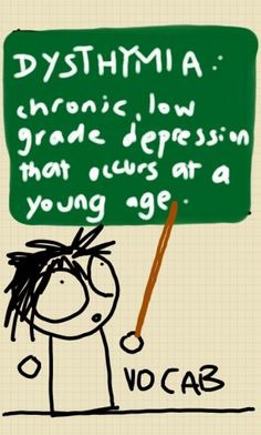 Dysthymia is a mild but long term (chronic) form of depression, symptoms last a long time up to two years and you suffer many high and low periods of depression. Dysthymia interferes with your entire life.