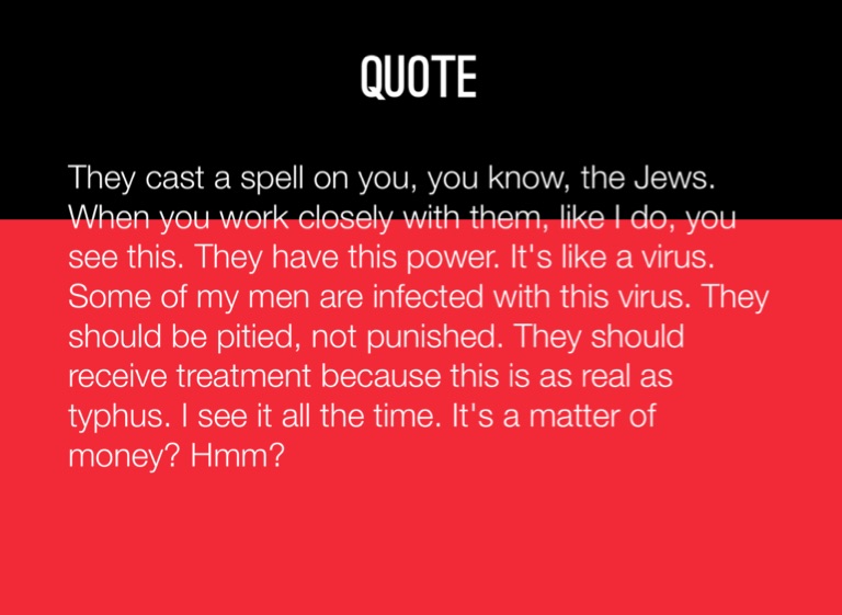 They cast a spell on you, you know, the Jews. When you work closely with them, like I do, you see this. They have this power. It's like a virus. Some of my men are infected with this virus. They should be pitied, not punished. They should receive treatment because this is as real as typhus. I see it all the time. It's a matter of money? Hmm?