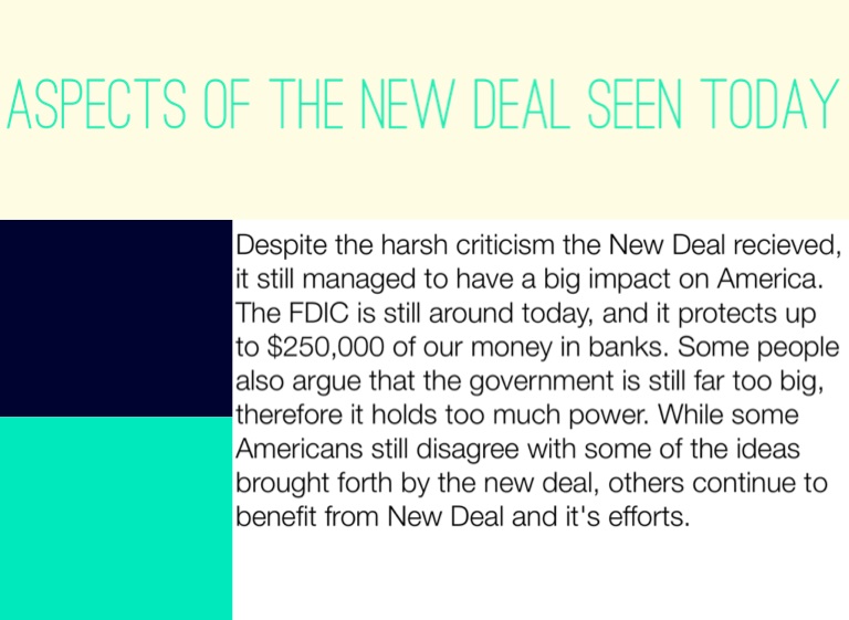 Despite the harsh criticism the New Deal recieved, it still managed to have a big impact on America. The FDIC is still around today, and it protects up to $250,000 of our money in banks. Some people also argue that the government is still far too big, therefore it holds too much power. While some Americans still disagree with some of the ideas brought forth by the new deal, others continue to benefit from New Deal and it's efforts.
