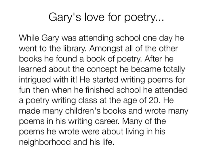 While Gary was attending school one day he went to the library. Amongst all of the other books he found a book of poetry. After he learned about the concept he became totally intrigued with it! He started writing poems for fun then when he finished school he attended a poetry writing class at the age of 20. He made many children's books and wrote many poems in his writing career. Many of the poems he wrote were about living in his neighborhood and his life.