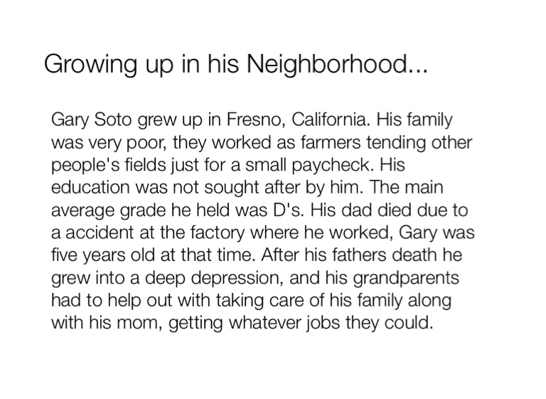 Gary Soto grew up in Fresno, California. His family was very poor, they worked as farmers tending other people's fields just for a small paycheck. His education was not sought after by him. The main average grade he held was D's. His dad died due to a accident at the factory where he worked, Gary was five years old at that time. After his fathers death he grew into a deep depression, and his grandparents had to help out with taking care of his family along with his mom, getting whatever jobs they could.