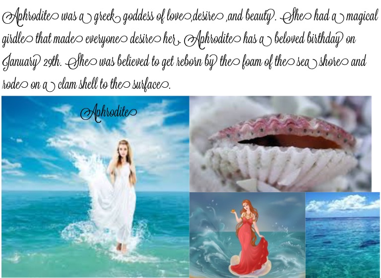 Aphrodite was a greek goddess of love,desire ,and beauty. She had a magical girdle that made everyone desire her. Aphrodite has a beloved birthday on January 29th. She was believed to get reborn by the foam of the sea shore and rode on a clam shell to the surface.