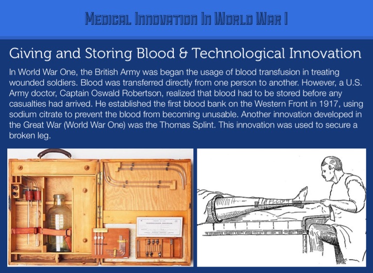 In World War One, the British Army was began the usage of blood transfusion in treating wounded soldiers. Blood was transferred directly from one person to another. However, a U.S. Army doctor, Captain Oswald Robertson, realized that blood had to be stored before any casualties had arrived. He established the first blood bank on the Western Front in 1917, using sodium citrate to prevent the blood from becoming unusable. Another innovation developed in the Great War (World War One) was the Thomas Splint. This innovation was used to secure a broken leg.