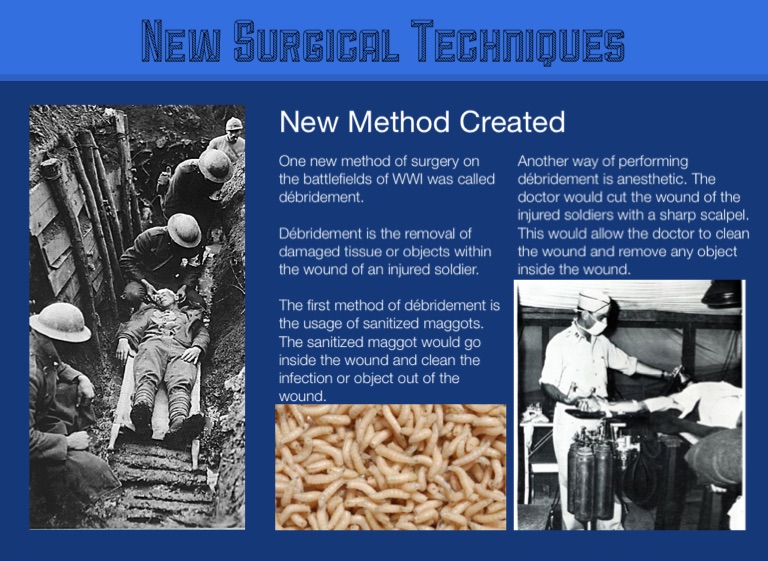 Another way of performing débridement is anesthetic. The doctor would cut the wound of the injured soldiers with a sharp scalpel. This would allow the doctor to clean the wound and remove any object inside the wound.