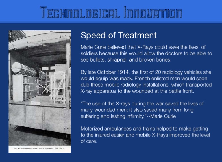 Motorized ambulances and trains helped to make getting to the injured easier and mobile X-Rays improved the level of care.