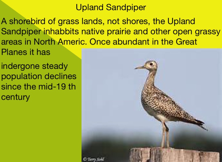 A shorebird of grass lands, not shores, the Upland Sandpiper inhabbits native prairie and other open grassy areas in North Americ. Once abundant in the Great Planes it has